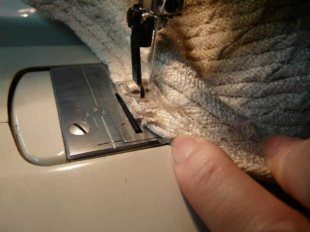 Ahora, usted puede poner el sombrero hacia atrás debajo de la máquina para formar el borde. Cuando estás haciendo el borde, no tire de la tira que está agregando. No vamos a estar tirando en la nueva tira más para el resto del proceso. Mantener la costura igual que antes, agregar nuevas filas en el borde, hasta que es tan amplia como quieras que sea. Pero lo saca de la máquina periódicamente para asegurarse de que el ala tiene el ángulo que usted desea que tenga.