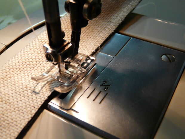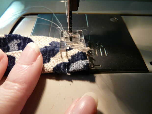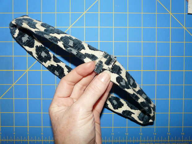 Doblar la banda de sombrero en mitad, asegurándose de que la costura larga es en la parte superior e inferior para que no muestran cuando hayas terminado. Zigzag sobre los dos extremos cortados de la banda de sombrero, uno a la vez. Luego, utilizando una puntada recta y un margen de costura de 1/2", coser la banda de sombrero en un tubo.