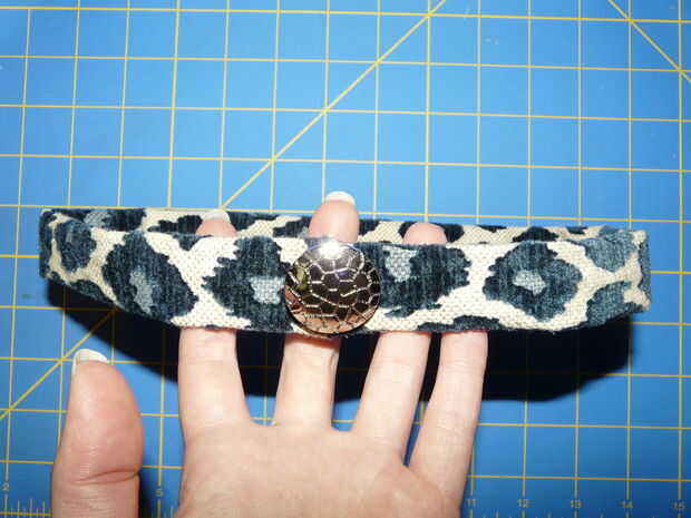 He añadido un botón plateado grande a la banda de sombrero, justo sobre el lugar donde me uní a los dos extremos. Usé el botón para colocar las flores de tela que vamos a hacer en el siguiente paso. El botón es opcional, usted puede utilizar tela yoyos, pompones, granos o lo que desea para el centro de tus flores. O, puede usar un arco en vez de una flor, o deja la banda de sombrero de la llanura; es totalmente hasta usted y la mirada que usted va para. Los botones ofrecen versatilidad adicional sin embargo, ya puede el botón de una flor nueva y cambiar totalmente el aspecto del sombrero.