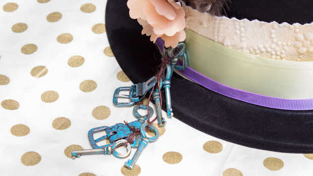 Para terminar tu sombrero, pegamento de la cinta más ancha alrededor de la circunferencia y sobre el papel realzado. A continuación, pegar una cinta más delgada, en un color contrastante. A continuación, fije los encantos, asegurar también al sombrero con una aguja e hilo. Embellecer su lujo párrafo con otros detalles para personalizarla más.
