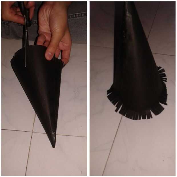 Hacer pequeños cortes en la parte inferior con unas tijeras. Esto ayudará en la fácil pegar cono a la base del sombrero