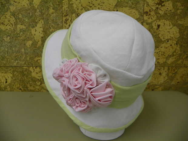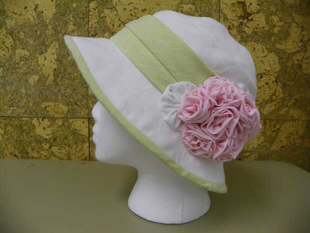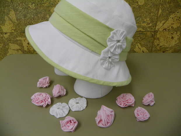 Pin el yo-yo y rosas de tela en la parte del sombrero, poner el yo-yo en primer lugar y de lo que les permite dar un vistazo hacia fuera debajo de las rosas un poco. He utilizado tela 7 rosas y 4 yo-yo de sombrero, pero usted puede apenas 3 o 4 rosas en el suyo. Al llegar donde quieres, coser a mano.