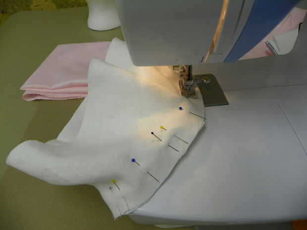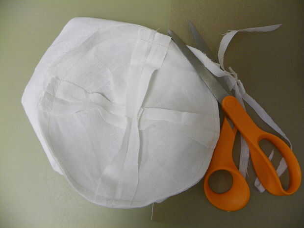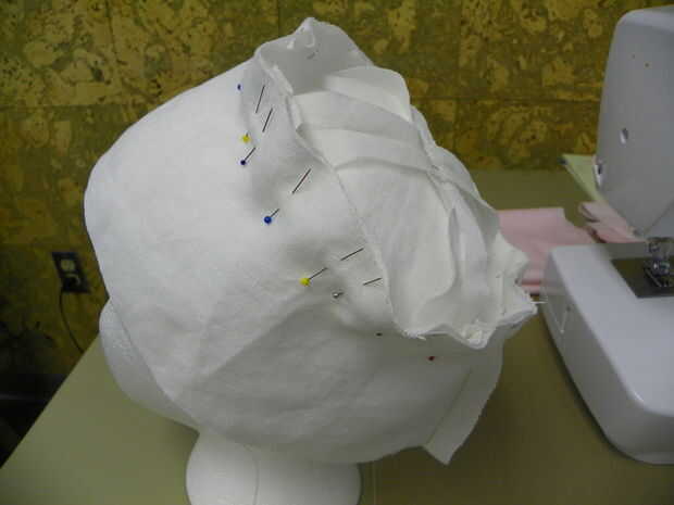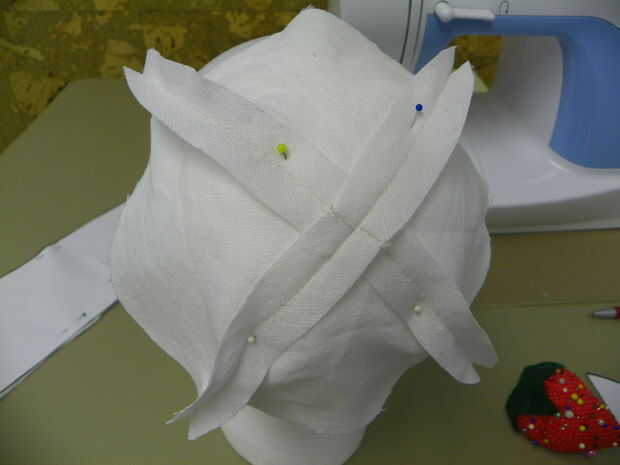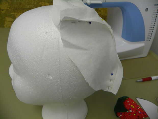 Coser las 4 piezas de la parte superior del sombrero con márgenes de 1/2" y luego presiona las costuras abiertas. Que cubrió la parte superior sobre la cabeza de espuma de poliestireno y unos pocos ajustes hasta que era la forma que quería. Luego cortar por el lado de la corona y había cosida a la costura trasera con margen de costura de 1/2". PIN los lados de la corona a la parte superior, juego de centro delantero y centro de la espalda. He cosido alrededor y luego recortar el margen de costura.