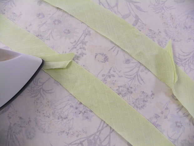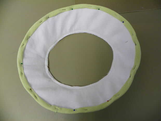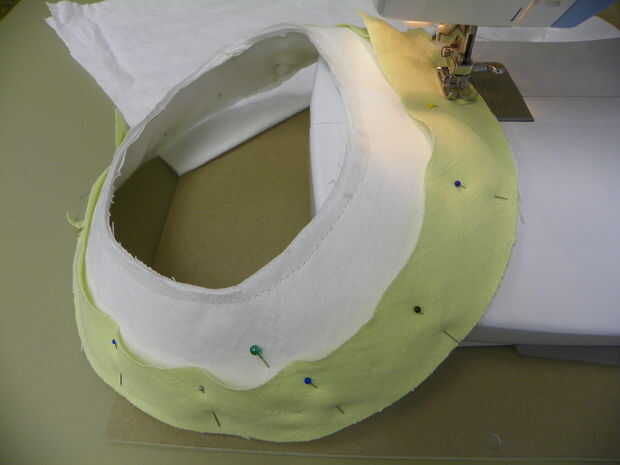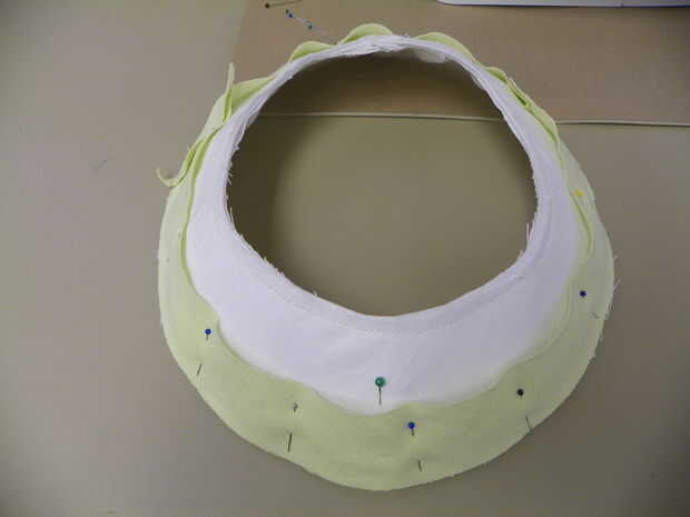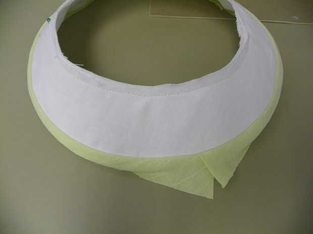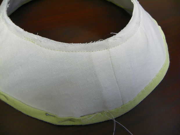 Para la guarnición corta tiras de 2 o 3 en el sesgo de 2" de ancho x 16" de largo. Cortando en diagonal le da un poco de estiramiento y permite que se cose alrededor de la curva de la visera. Coser los extremos de las tiras juntos hasta que la tira es suficiente para recorrer todo el filo del borde.  Pulse las costuras abiertas. El perno alrededor del borde del ala.  Con la máquina de coser, coser el adorno hasta el borde. Girar bajo 1/4" y girar bajo otra vez. Perno en su lugar. Coser a mano con puntadas pequeñas.