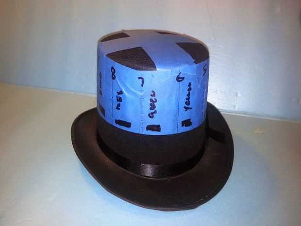 LED cada pierna tiene que pasar por el sombrero y necesita hacer un agujero para cada pata del LED. Aunque usted podría pensar que esto es un sombrero "barato", el fieltro es muy fuerte. Traté de empujar los LEDs a través de. Sin suerte, las piernas flexionadas. Encontré que si usé un clavo de acabado pequeños o un punzón pequeño podía hacer el agujero. Yo también todo etiquetados por lo que no se comete un error más adelante. Decidí que quería cada fila para ser su propio color y lo escribí en la cinta para que pudiera estar seguro de que no terminan con dos del mismo color al lado de uno.