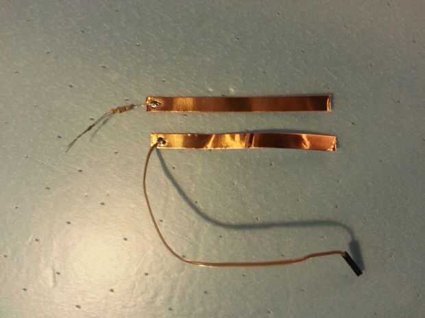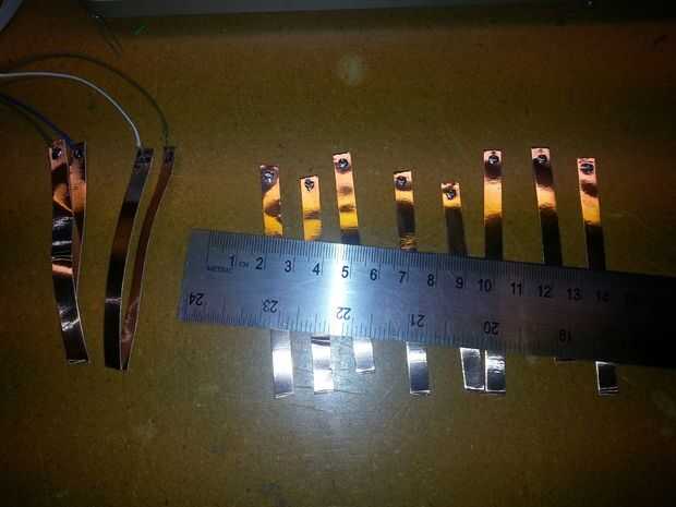 Se necesita un (+) positiva y (-) negativo tira de cobre para cada fila de LEDs. Se suelda el resistor en la tira negativo (-) y el cable de conexión para el LED mago va en el positivo. Cada uno fue pelea de seis pulgadas de largo.