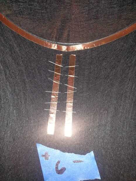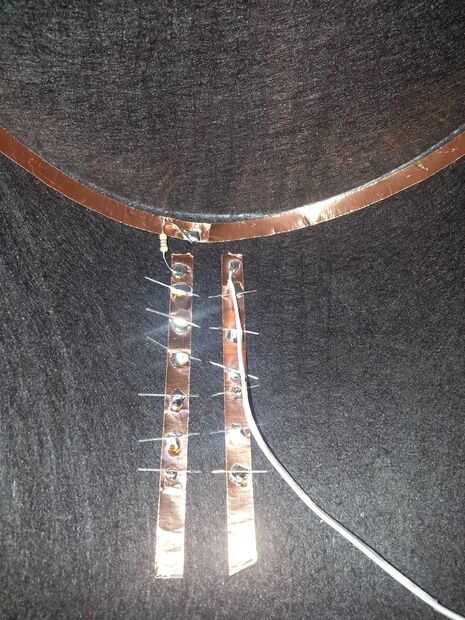 Añadir las tiras de cobre que preparado. De nuevo, resistencia va en negativo, corto, lado de los LEDs. Sosteniendo firmemente en el LED de la parte de afuera doble las piernas separadas. El LED debe estar firmemente asegure en su lugar. Ahora estás listo para la soldadura de las patas del LED para la cinta de cobre.