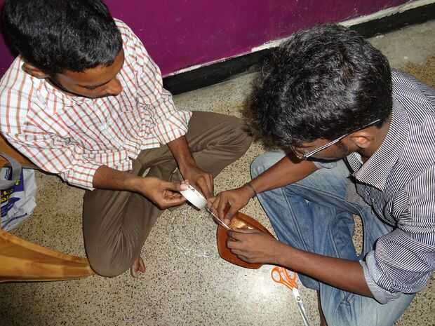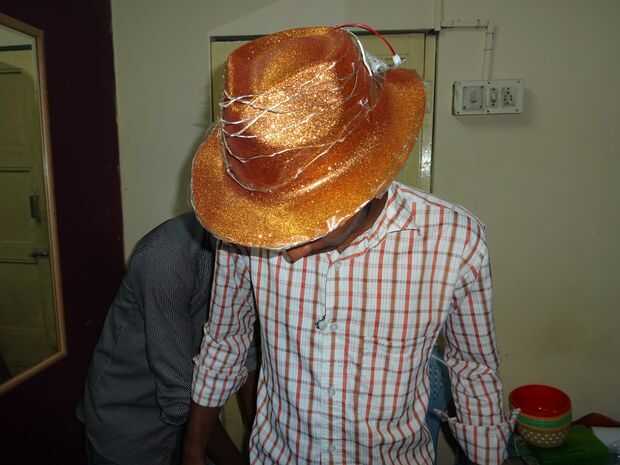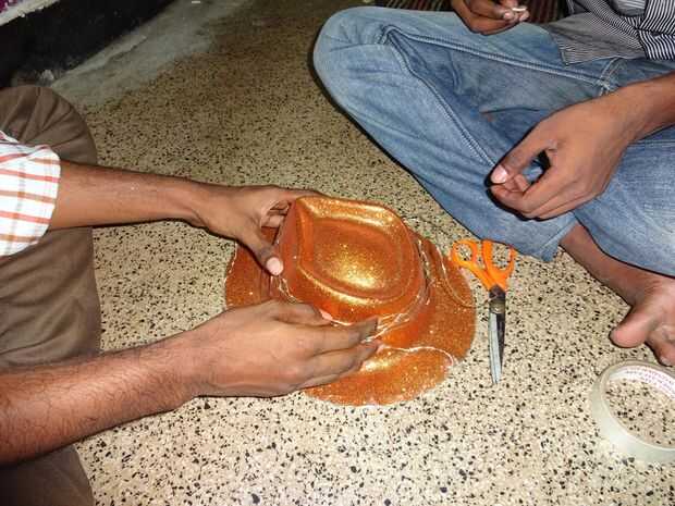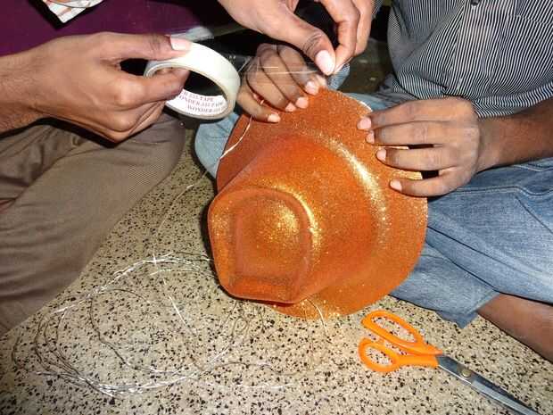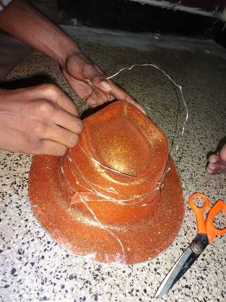 1) pegar la cadena LED alrededor de la tapa y pegar con una cinta de cello, no use pegamento para pegarse a la tapa permanentemente si usted está planeando utilizar el sombrero sin luces.