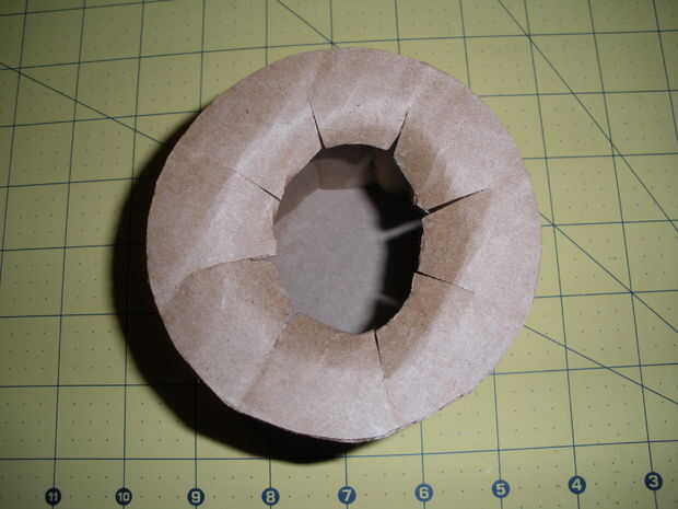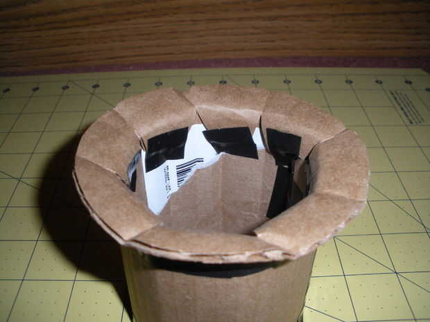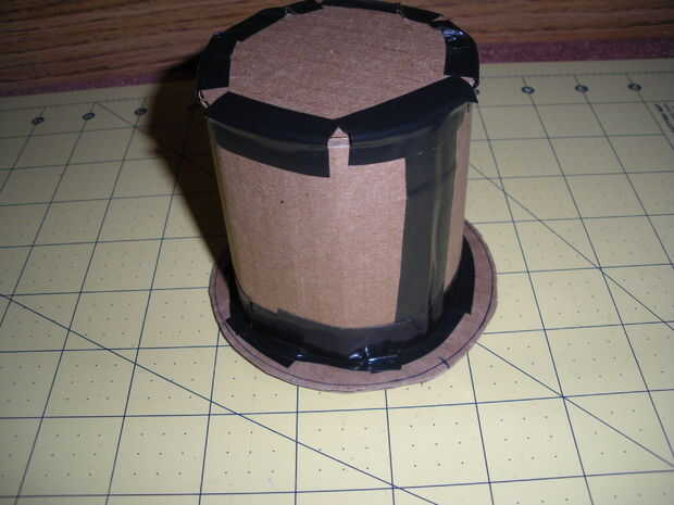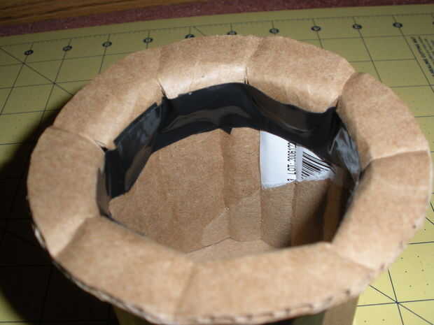 Cuidadosamente con pequeñas tiras de cinta, cinta el círculo pequeño en un extremo del tubo. Fijar el tubo en la parte superior del círculo grande, coloque la parte superior e inferior mitad del sombrero usando las pestañas precortadas de antes. Doble en el sombrero y la cinta hacia abajo. Por último, utilice un pedazo largo de cinta a cinta alrededor del dentro de la parte inferior del sombrero para asegurar las lengüetas hacia abajo. Ahora tienes el marco básico para trabajar con.