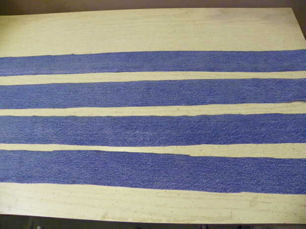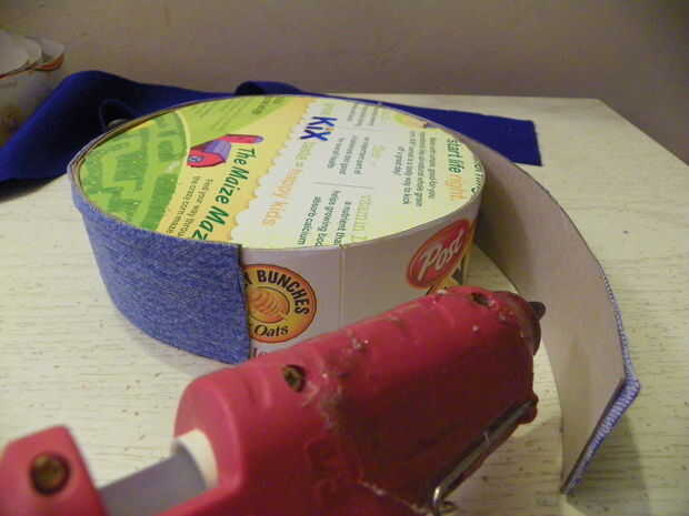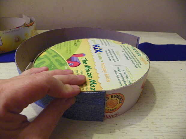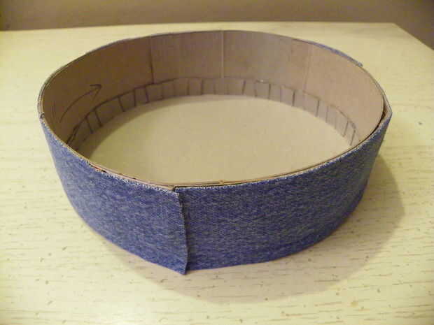 Conseguir un viejo par de pantalones vaqueros y corte tiras de 2" de ancho por 24" de largo.  Hacer otro cartón tira de 2 "x 24", pegar el dril de algodón para el exterior de esta. Pegar esta tira del dril de algodón cubierto hacia el exterior del sombrero.