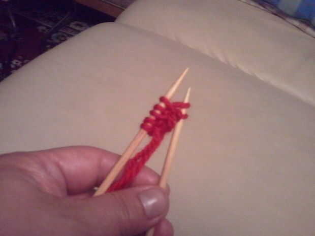 Fila 1. la primera puntada del resbalón purlwise aumentar tejer la espalda y la parte delantera (KFB), tejer el espalda stich, stich pasado de punto, girar a la
