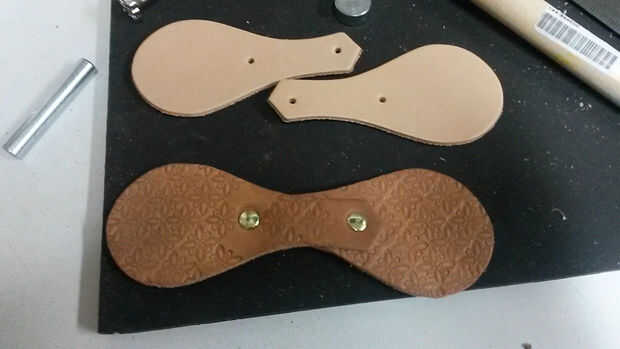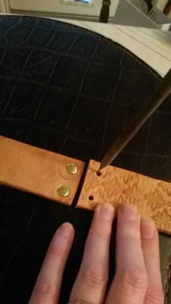 Recortar si es necesario, perforar agujeros en el cuero, taladre los agujeros en la caja y remache en la parte inferior.