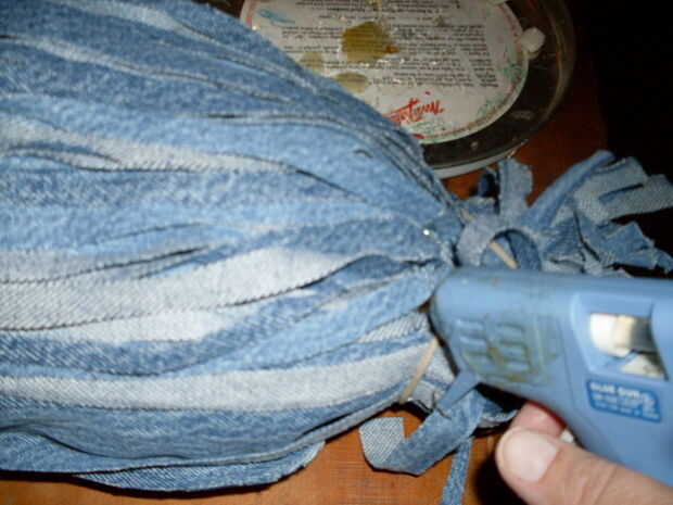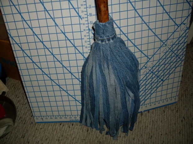 Envuelva la parte superior sin cortar alrededor de la manija de la escoba donde se encuentra con el bolso de jean. Repita con las otras secciones hasta parece completo.