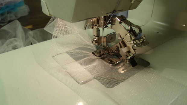 Si no tienes uno, puede ejecutar una puntada de hilvanado por el borde y la mano tire el fruncido como lo haría normalmente para la fabricación de faldas o mangas. También puede comprar previamente con volantes de encaje en el lugar de reunión de tul, pero que será considerablemente más costoso.