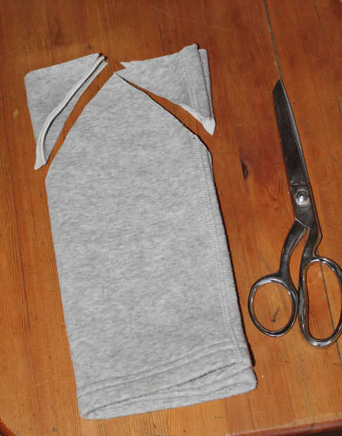 Dobla el material por la mitad.  Cortar las dos esquinas.  Utilizo a mi máquina por lo que puedo los cantos cuando cosen, pero si vas a usar una máquina de coser desea cortar los bordes más redondeados antes de coser.