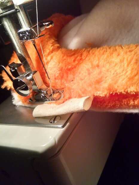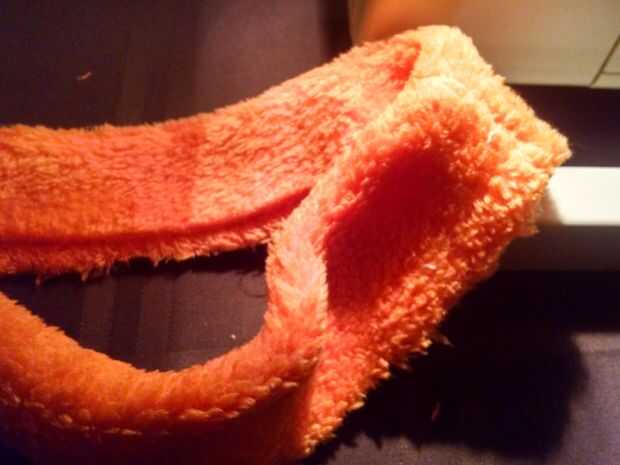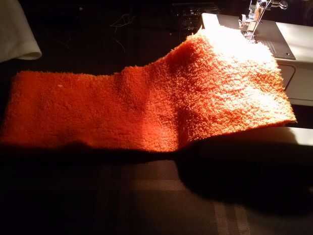 Doblar la parte inferior por la mitad con el lado "bueno" en el centro. Coser los bordes cortos para hacer una sola banda.