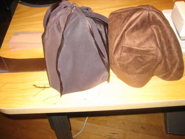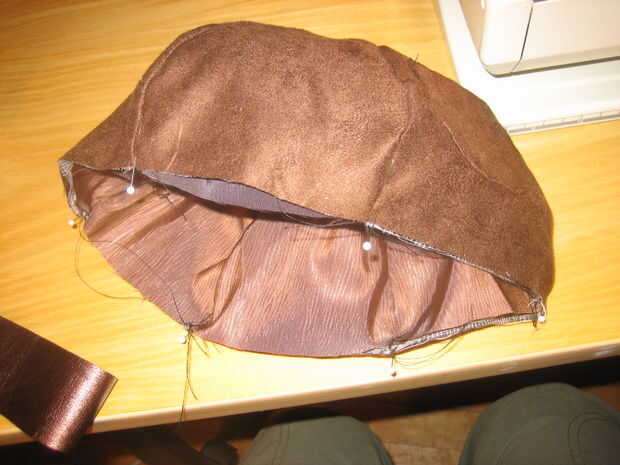 Ahora, ponemos la corona y el forro juntos, con todos los bordes crudos dentro. Alrededor de los bordes del perno y ejecutar una línea de puntadas para sujetar el forro en su lugar a la corona. Debe ser empezando a parecer como un sombrero real ahora.