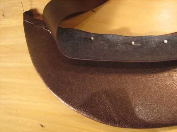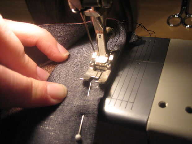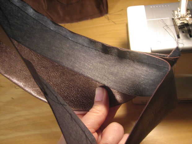 Luego, coser el borde de la banda. Esto es un poco complicado ya que está cosiendo una pieza recta (el borde de la banda) a una pieza curvada (el borde), y la curva no es muy flexible. Tómelo lento y sentir a través de la tela para los bordes de cada par de pulgadas. Asegúrese de que no eres un) costura mediante el refuerzo de borde plástico o b) conseguir demasiado cerca o fuera del borde de la costura.