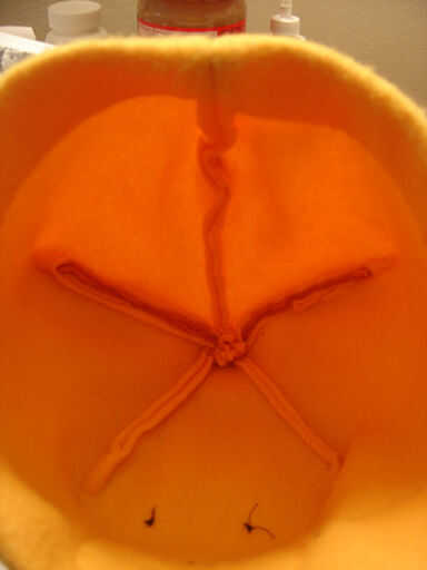 Le aguanté el sombrero derecho-lado-hacia fuera y averiguado cuánto quería la crines y orejas de palo, llevó a cabo entre la tela y voltea el sombrero al revés.
