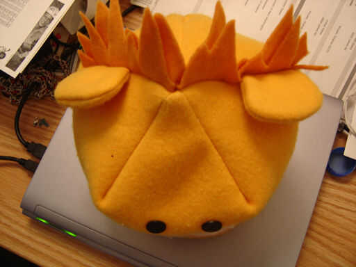 Luego cosí a través de toda la juntura de un lado del sombrero con el otro, la fijación abajo de la crin y las orejas.