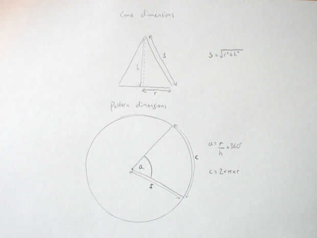 Puede utilizar un trozo de cuerda este largo para medir hacia fuera de su arco o puede utilizar el cociente de la circunferencia del círculo a la circunferencia del cono base patrón para calcular el ángulo del segmento.