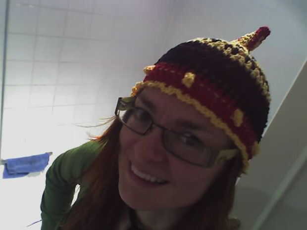 Se trata de un sombrero de caballero que diseñó mi hija. Diseño que es como una campana en el invierno con 2 colas de cerdo en los lados para la diversión. Tiene un cuello de bufanda-como que mantiene el cuello caliente. Espera es divertido y un buen