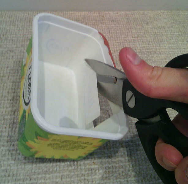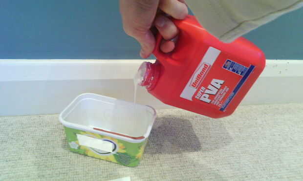 -Un pote plástico (tal vez un viejo pote de margarina). Esto es para mantener el pegamento en así que usted puede simplemente tirarlo lejos luego, no necesita a limpiar y después de todo que no quiere PVA a vajilla favorita de tu madre ¿te? También se podría utilizar el fondo de un cartón de leche de plástico. Cortar un rectángulo de su maceta a utilizar como un separador para separar el pegamento.