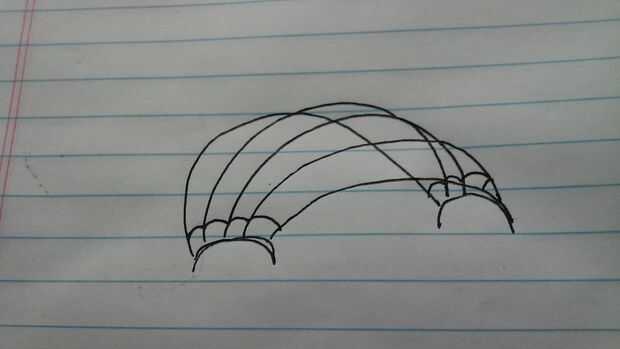 Después de mirarlo, tuve un eureka momento. Sendas asambleas fijadas, curvadas, con ranuras de polo. Un agujero en cada extremo para permitir uso de espiga tienda para mantenerlo en el suelo. No permite la cubierta plegable, pero debería funcionar para prueba de concepto.