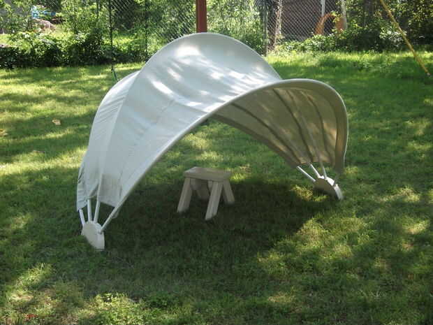 Los niños les encanta. Que es el factor más importante. También, logré mis objetivos de un parasol exclusivo de materiales de bajo costo. ¿Hacerlo otra vez? Apuestas. Pero cuando el dosel de la hoja finalmente da para arriba, creo que voy a hacer uno de material ligeramente más pesado. Además, creo que me permiten los extremos ligeramente más alargados para permitir un mayor espacio interior.