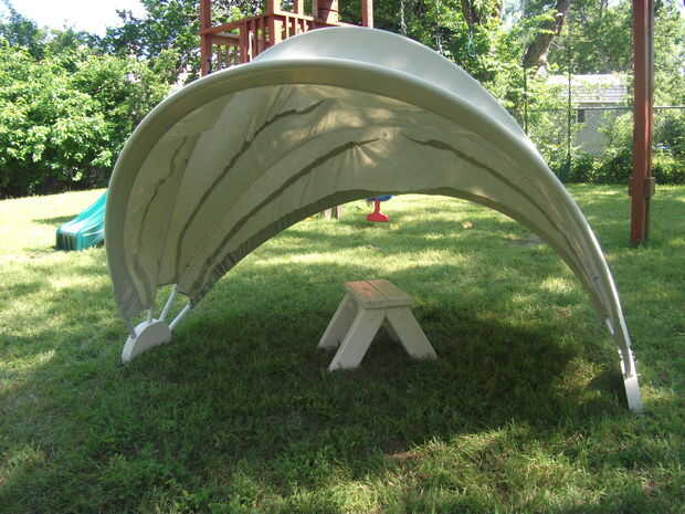 Como dimensiones, los soportes de extremo se colocan 6 pies aparte. El pvc en los agujeros y dobla sobre. La hoja tendrá que ser cosido basado en la distancia entre aros, que es totalmente dependiente en cuánto usted espaciados los agujeros... así que tendrás que improvisar algo.