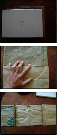 -Reunir todas las piezas, con una pieza en el centro. Alinee cada pieza para que los trazos de la parte superior y lateral de su ordenador portátil, satisfacer. Cinta y doble piezas dos-A y dos B pieza uno. Todas las tres piezas deben ahora se unieron en el punto donde se trazaron los lados de vosotros tiene ordenador portátil. Ver imagen 3.