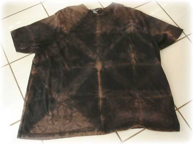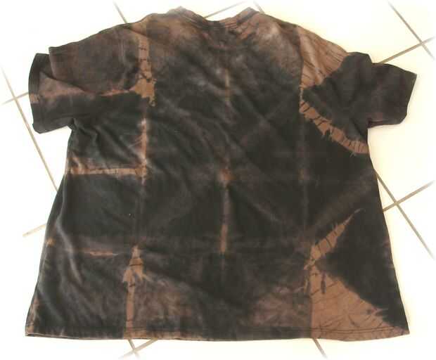Esto fue una camiseta dura y no quería ser no teñido. De hecho yo sin envolver después de 20 minutos y mucho no hubiera pasado nada, así que tuve que atar para arriba otra vez y poner nuevamente la esperanza de que el tinte saldria antes de que el blanqueador comió la camisa! Finalmente desatado y empapado y aquí están los resultados. Tal vez si hubiera sido un disolvente o una prenda de menor calidad, el patrón puede han sido más pronunciado! Es algo sutil, sin embargo! Definitivamente un verdadero hijo de negro aburrido!