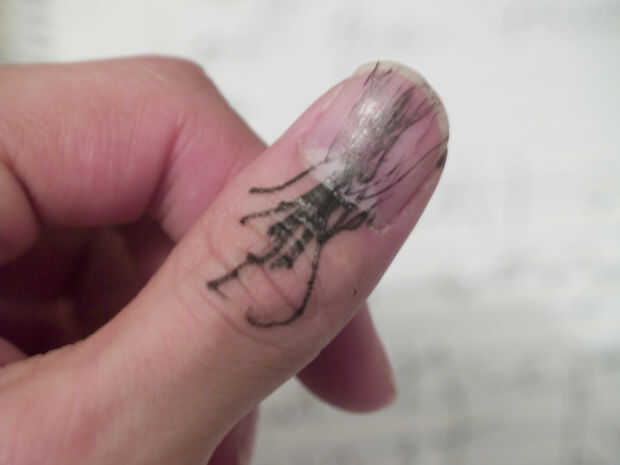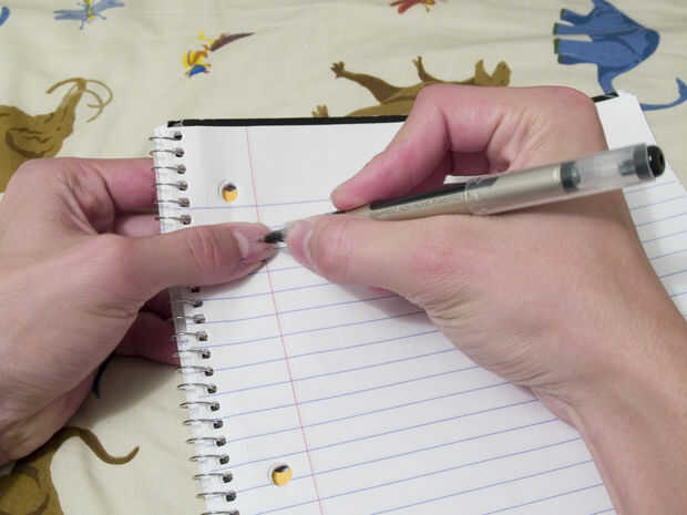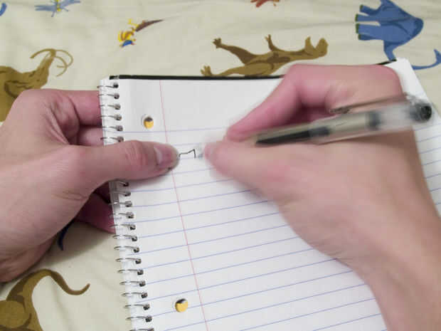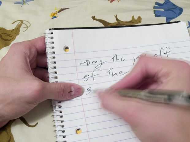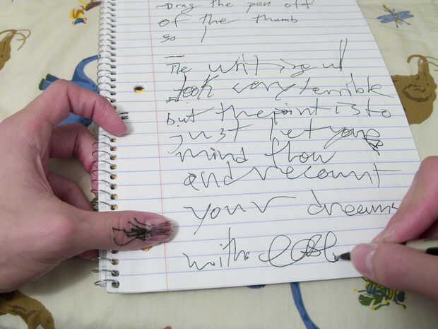 El pulgar de la mano izquierda se utiliza como una guía de donde escribes en la página (ver imágenes). Presione la pluma sobre la uña y arrastrar ligeramente sobre la página. Esto es donde debe viajar la línea de la escritura de izquierda a derecha. Una vez en el lado derecho de la página, mueva el pulgar hacia abajo alrededor de una pulgada para iniciar una nueva línea. Esto me mantiene adivinando mi paradero en una página y escribir accidentalmente sobre un ya difícil de leer la línea de texto. Lo más importante, esta técnica me permite cómodamente mantener mis ojos cerrados mientras escribiendo lo que recuerdo del sueño.