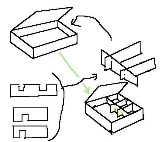 Tenemos que decidir sobre las piezas necesarias. Vamos a ver. Parte inferior, parte superior y cuatro lados de la caja principal. También necesitaremos tres láminas para las paredes interiores.