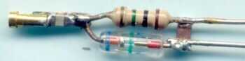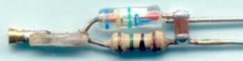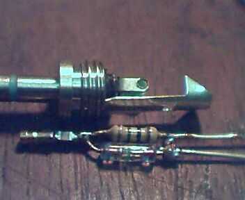 usé una astilla pequeña de la placa de circuito para C1. El zócalo del perno dada vuelta se ajustó a un extremo, el condensador que C1 soldadas a él y entonces la resistencia y el diodo conduce formado a forma y soldar al condensador. Se muestra al lado del jack de auricular estéreo para ver si caben. Ajustar tamaños, conseguir un condensador más pequeño etc. hasta que lo haga.