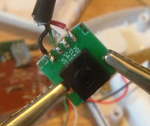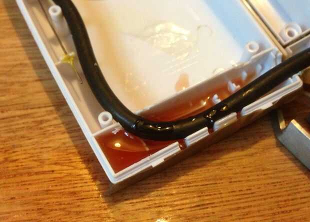 Mientras tenemos la solución de resina va, podemos vertemos un poco en la parte inferior de la unidad del sensor para actuar como retenedor de cable hay así. Sólo inclinar un poco la unidad de plástico a un lado y sostener durante 10 minutos o menos.