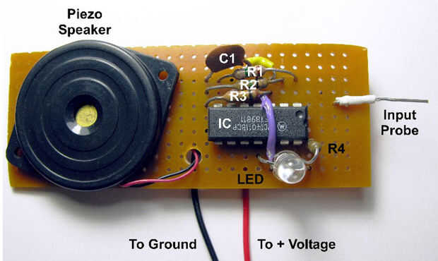 Una sonda de tensión puede ser muy útil al solucionar problemas de circuitos. Éste indica un voltaje positivo con un tono y un LED que brilla intensamente. Es accionado por el circuito sometido a prueba, por lo que no necesita ninguna fuente de alimentación a bordo. El circuito usa CMOS 4011 quad gate. Puertas 1 y 2 forman un oscilador de audio con una frecuencia determinada por C1 y R3. La señal desde el oscilador conduce un altavoz piezoeléctrico. Puerta 3 sirve como un amortiguador que lleva el LED. En operación, IN sirve como una punta de prueba de entrada. Se aplica energía al conectar + V y tierra para, respectivamente, la fuente positiva y tierra del circuito sometido a prueba. Cuando la señal en IN es baja o cuando IN no está conectado a un circuito externo, R1 tira la entrada a la tierra (bajo) y mantiene el oscilador y el LED apagado. Cuando la sonda IN es alta, el oscilador emite un tono y el LED se ilumine. Original de un Mim Forrest II!