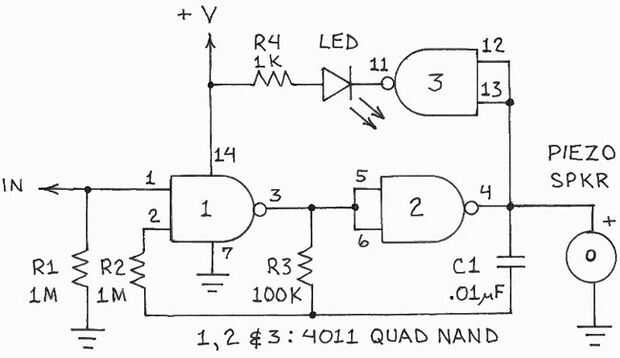 El circuito fue montado y probado en una placa sin soldadura y probado. Cuando el circuito estaba funcionando correctamente, los componentes fueron transferidos a un tablero de 2.9 x 1.25 pulgadas (7.5 x 2.9 cm) corte de un tablero de prototipo perforada y soldar en su lugar. La Junta debe cortarse desde el extremo que tiene filas paralelas de tres y cuatro agujeros conectados. (No utilice el extremo de la tabla con filas paralelas de dos agujeros conectados).