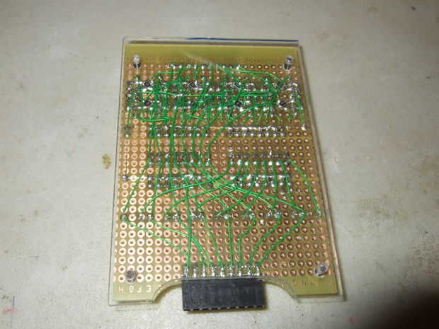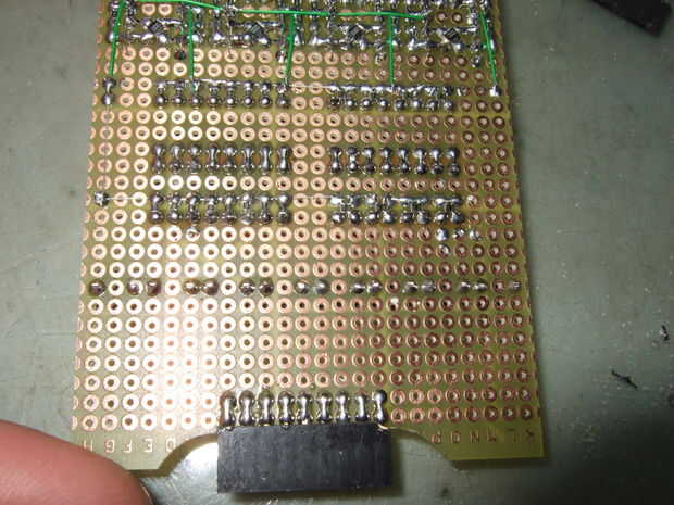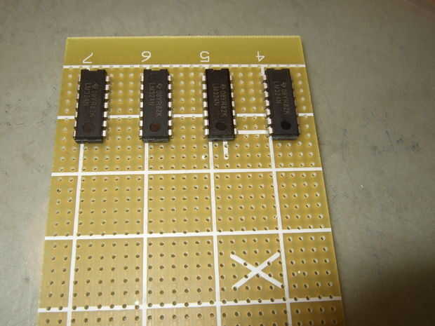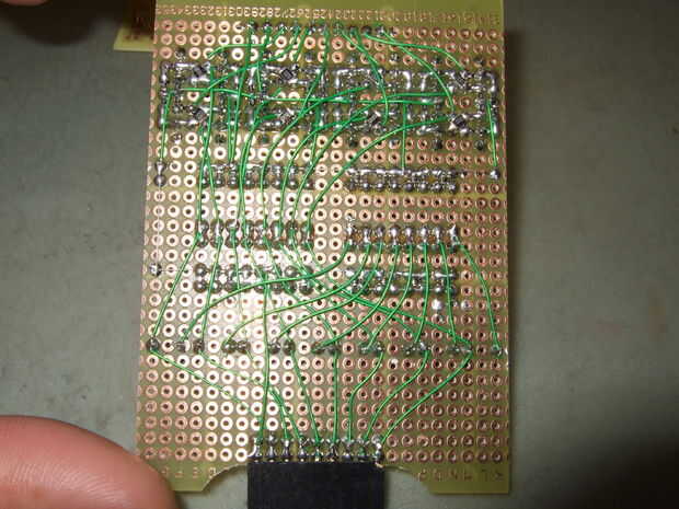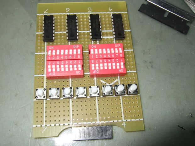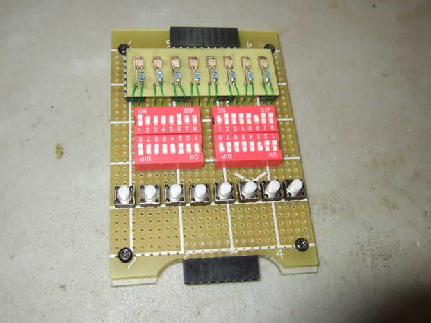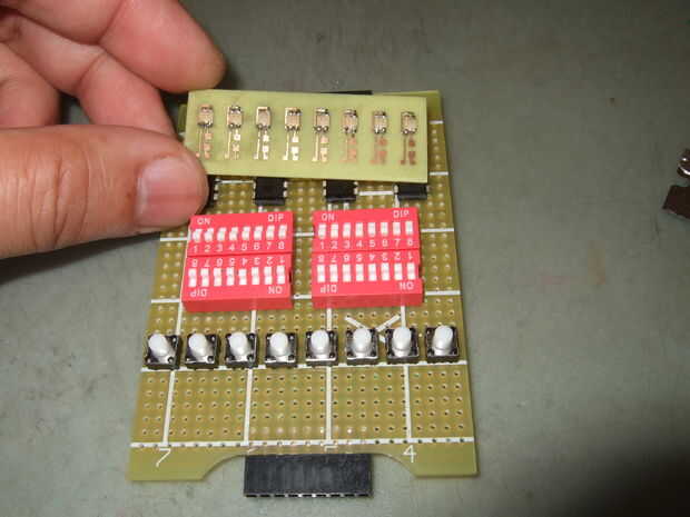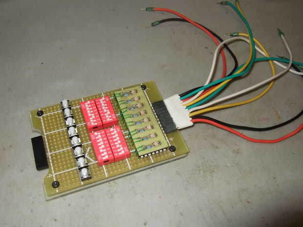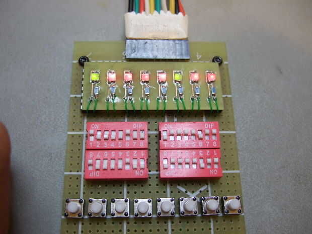 Se hace usando 4 x LM324 cuatro opamps, dándole un total de 8 canales. Uso de 4 interruptores DIP, cada canal tiene un pullup configurable individualmente o desplegable, así como un interruptor táctil que es individualmente configurable en el riel de positivo o de tierra. El mazo de 10 cables tapones en el orificio superior: 1 plomo para cada canal y los otros dos cables de alimentación y tierra. Orificio inferior da acceso a las mismas conexiones, menos el carril positivo - para la conexión fácil a mi analizador lógico de 8 canales.