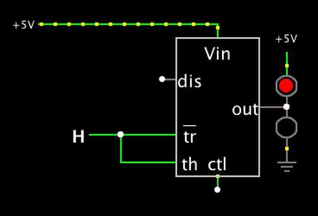 He hecho una simulación de la misma, cuando la entrada es 1 o alta la salida se establece a 0 o bajo, que permite el red(1) condujo a levantarse GND una luz, entonces cuando la ponga en 0 o baja la salida es 1 o alta que permite el green(0) condujo a obtener VCC y enciende.