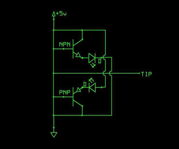 Con ningún divisor de tensión los dos LED está siempre débilmente en. Si esto no volverte loco podría construir una sonda lógica con cuatro componentes. Tenga en cuenta que necesitará usar resistente LED ya que no haya Rop para limitar la corriente
