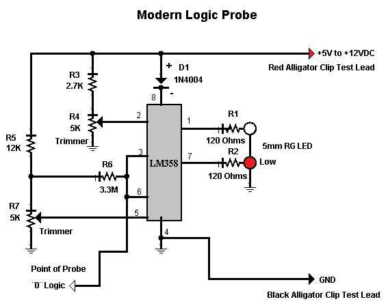 Esto tiene que ser la punta de prueba lógica práctica más simple que se puede construir. A lo más consiste en dos transistores (uno NPN y un PNP) tres resistores y dos LED. Pueden caber en el más pequeño de plumas. No hay ninguna manera de distinguir