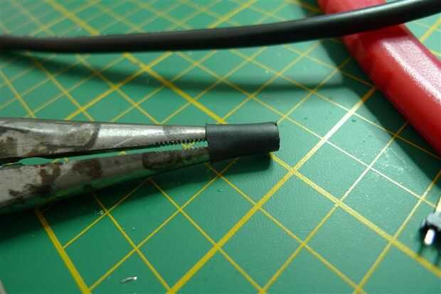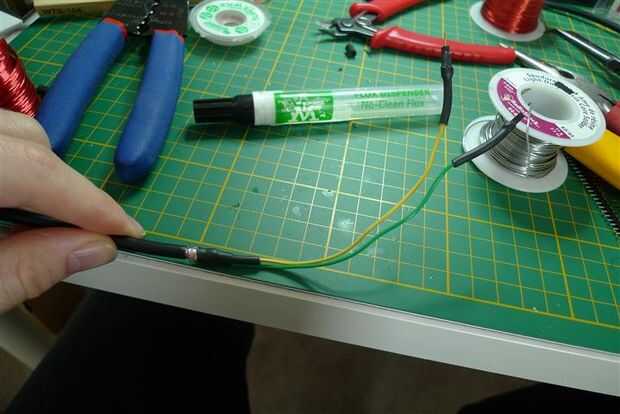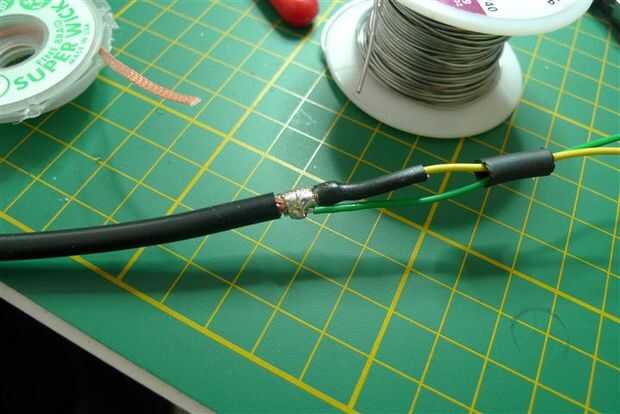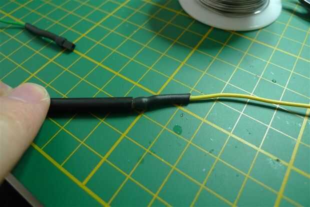 Un alambre de 10cm sobre el alambre de cobre expuesto en el centro del cable de la soldadura. Luego coloque algunos tubos termocontraíbles en allí para fortalecer todo para arriba y aislar la conexión. Que se vea como la segunda foto hay. Tenga en cuenta que más adelante ayuda cuando usted utilice amarillo/rojo como el cable de señal y negro/verde como el cable de tierra.