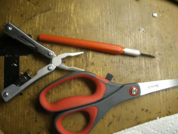 tijeras, cuchillo, alicates, pegamento, un taladro y soldadura material.