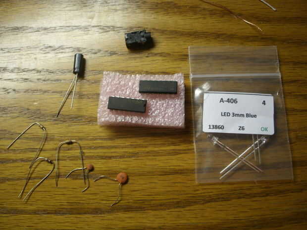 Algunos condensadores y resistencias; los condensadores son 10, 0.1 y 0.01 uf. resistencias pueden variar.