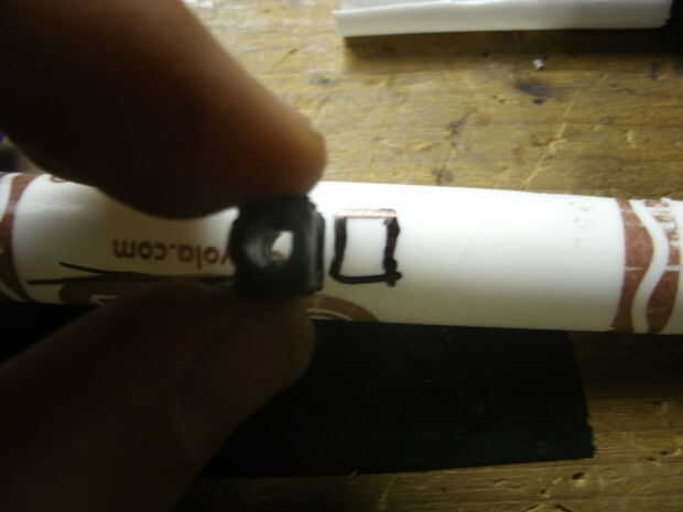 Desmontar el marcador y pluma. Coge el taladro y con algo parecido a un taladro de broca 1/4 pulg a lo interior que mantiene la punta de fieltro en su lugar. Hacer un agujero en la tapa del extremo.