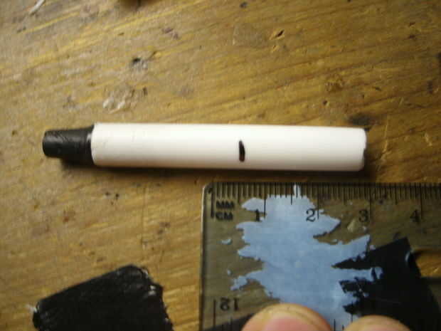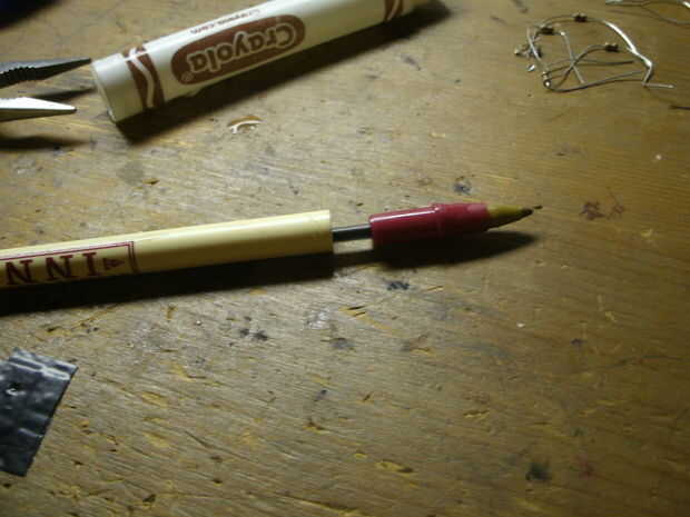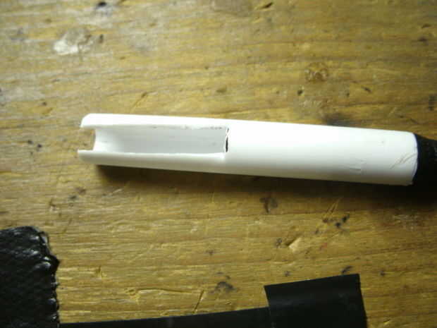 Haz de la punta de la pluma y corte el cuerpo a unos 6 cm. Corte una ranura en él cerca de 2 cm de largo, puesto que el interruptor tendrá algún espacio más adelante.