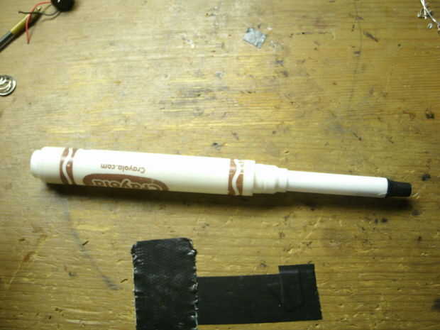 Palillo de la pluma en el marcador y el Tirefly en la pluma. Poner algunas capas de cinta adhesiva alrededor de la base de la pluma en el marcador; Esto detendrá la parte superior de extender demasiado.