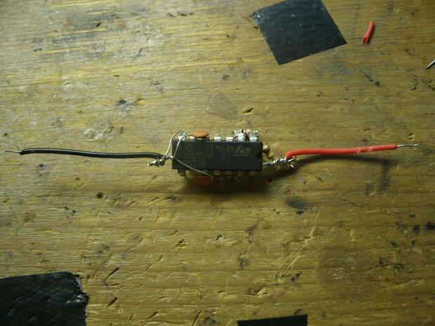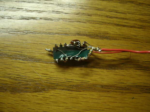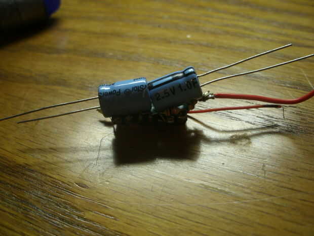Puesto que el espacio es una prima aquí, esto se suelda tan compacto como sea posible. Se puede ver en las fotos que puse las resistencias y puentes hacia el interior de conexión en el lado positivo común y los más voluminosos condensadores a lo largo de la parte exterior. Los supercaps conectará end-to-end, la negativa de uno va a lo positivo del otro, y como una unidad (unidad) encajan en el conjunto montaje 556. Colocar tierra en el diagrama al lado negativo de los supercaps de serie, pero no lo hace por el lado positivo!