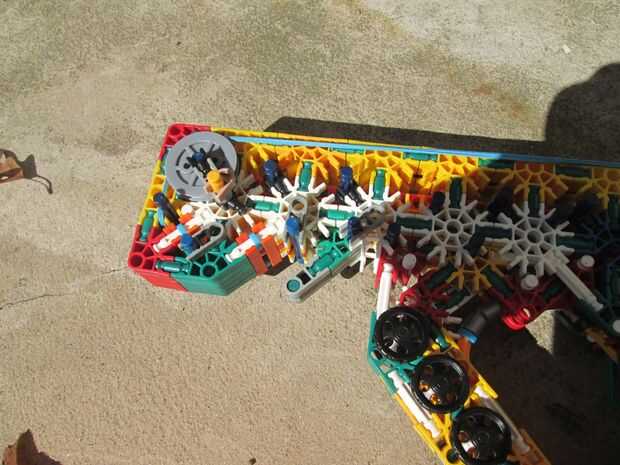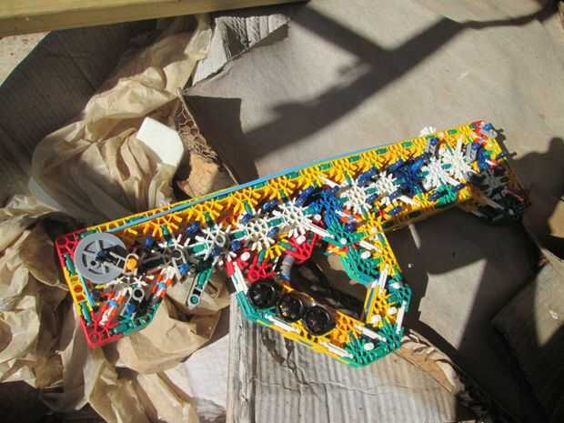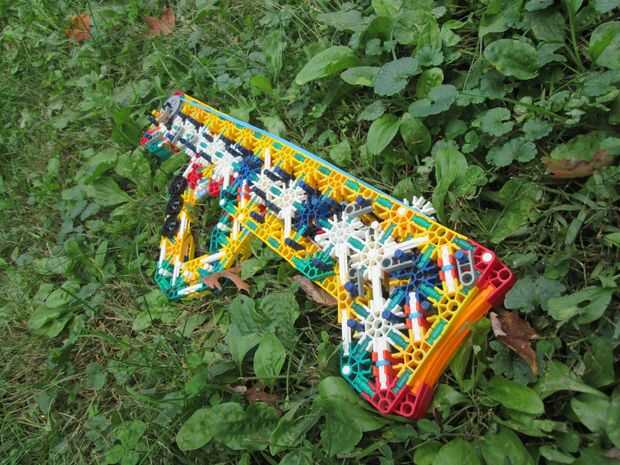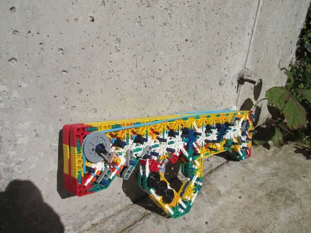 Esta pistola puede disparar oodammo ruedas y otras partes de KVG. La gama de este lo está bien pero no el mejor por lo que si tienes alguna idea sobre cómo puedo mejorar por favor deja me un Consejo en los comentarios. He hecho un disparo simple pero eficaz para este rifle que utiliza una cadena de barras interconectadas que tira un clip Y conectado a un conector amarillo abajo y fuera de la manera. Una varilla de corte se utiliza en el gatillo pero se podría reemplazar por trastear un poco.